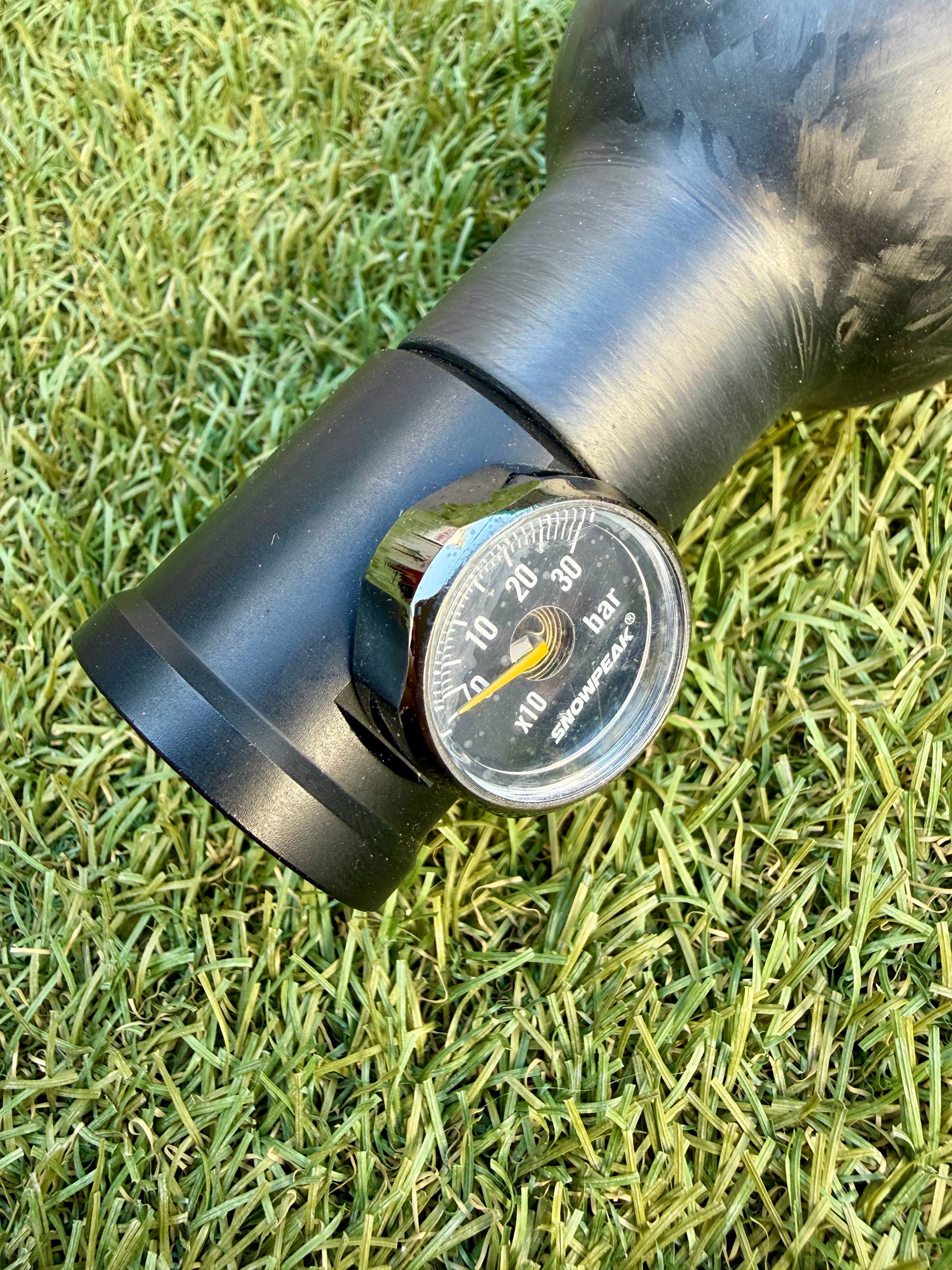 Incorpora válvula antirretorno para una carga segura, conexión rápida europea compatible con la mayoría de sistemas de carga PCP, y manómetro integrado para un control preciso de la presión en todo momento.