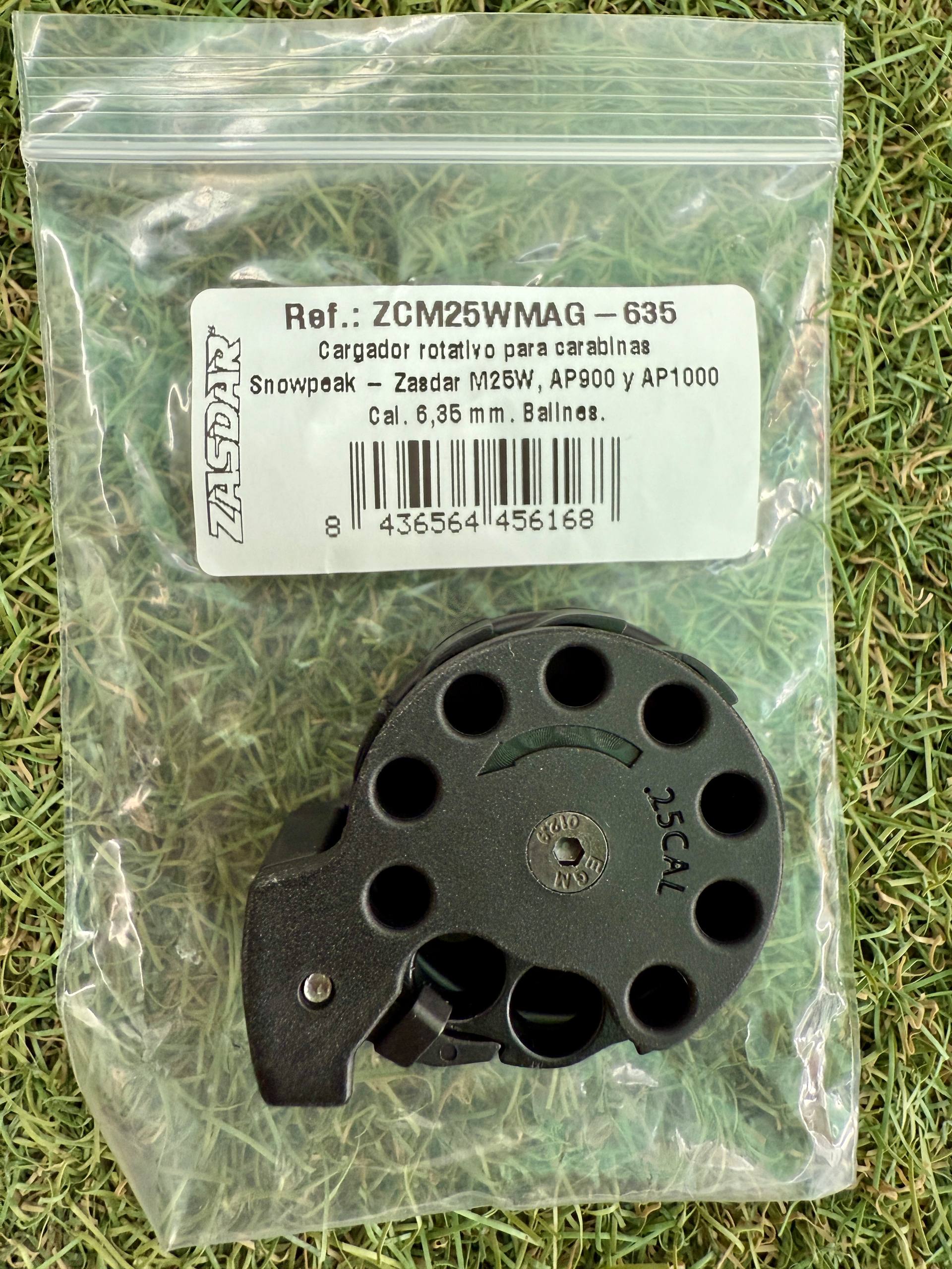 Cargador rotativo Snowpeak 6.35mm M25W – AP1000 – AP900. Cargador rotativo con capacidad de 10 balines para carabinas M25W, AP1000 y AP900 de las marcas Snowpeak /Artemis / Zasdar.