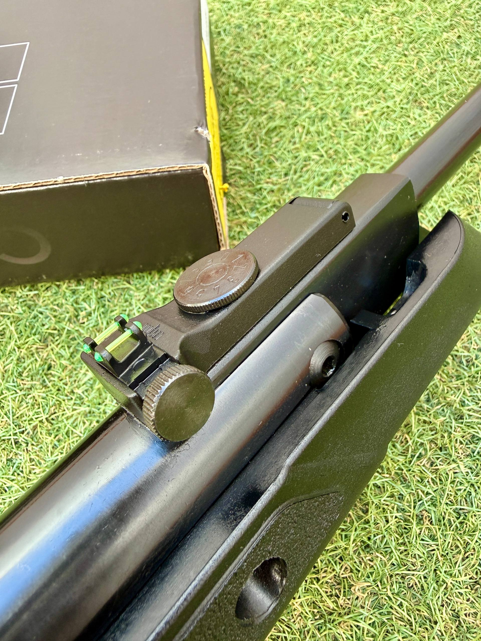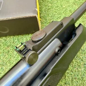 El sistema de miras abiertas tipo Truglo combina un punto delantero fijo con fibra óptica fluorescente anaranjada y un alza micrométrica regulable en altura y deriva con fibra óptica verde, facilitando una adquisición rápida y precisa del objetivo.