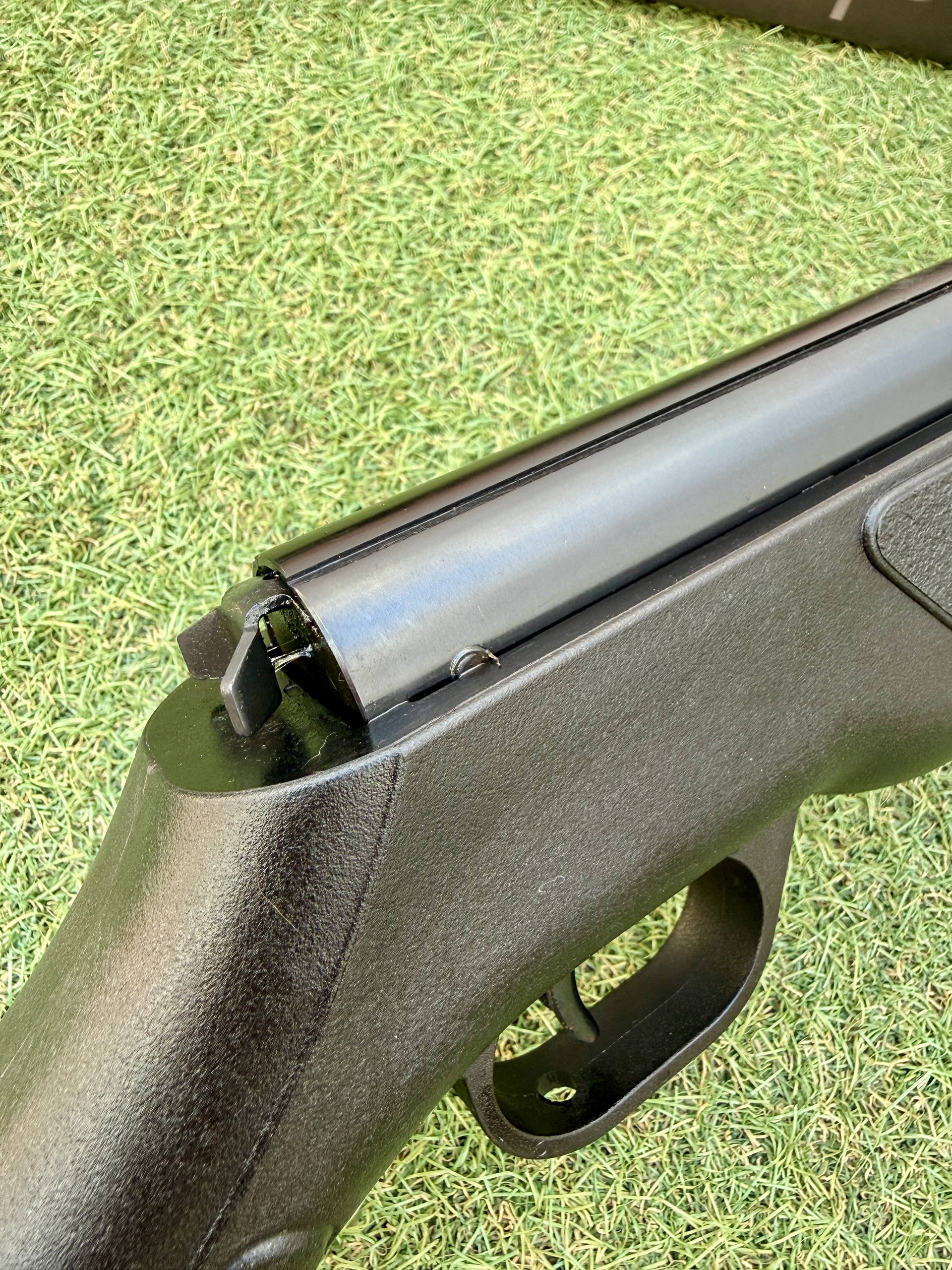 Incorpora un cañón compacto de acero estriado amartillado en frío, equipado con bocacha metálica con supresor de ruido que reduce el sonido aproximadamente un 50%, mejorando la experiencia de disparo.