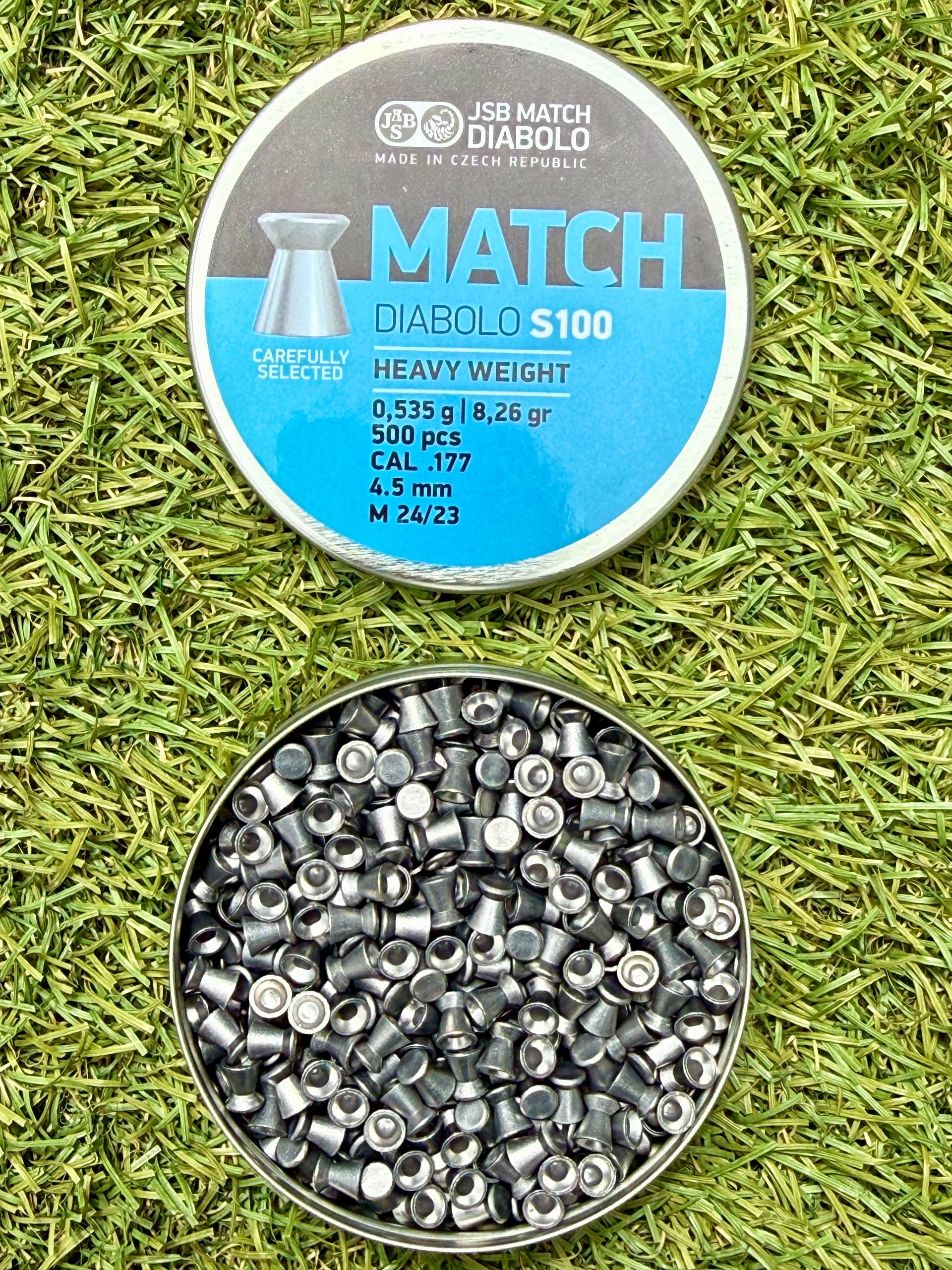 JSB Match Diabolo S100 Heavy Balines 4.5mm. Balines de plomo de punta plana para tiro de alta precisión con carabinas de aire comprimido. Son balines de vuelo estable debido a su mayor peso y a la ubicación ideal del centro de gravedad.