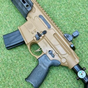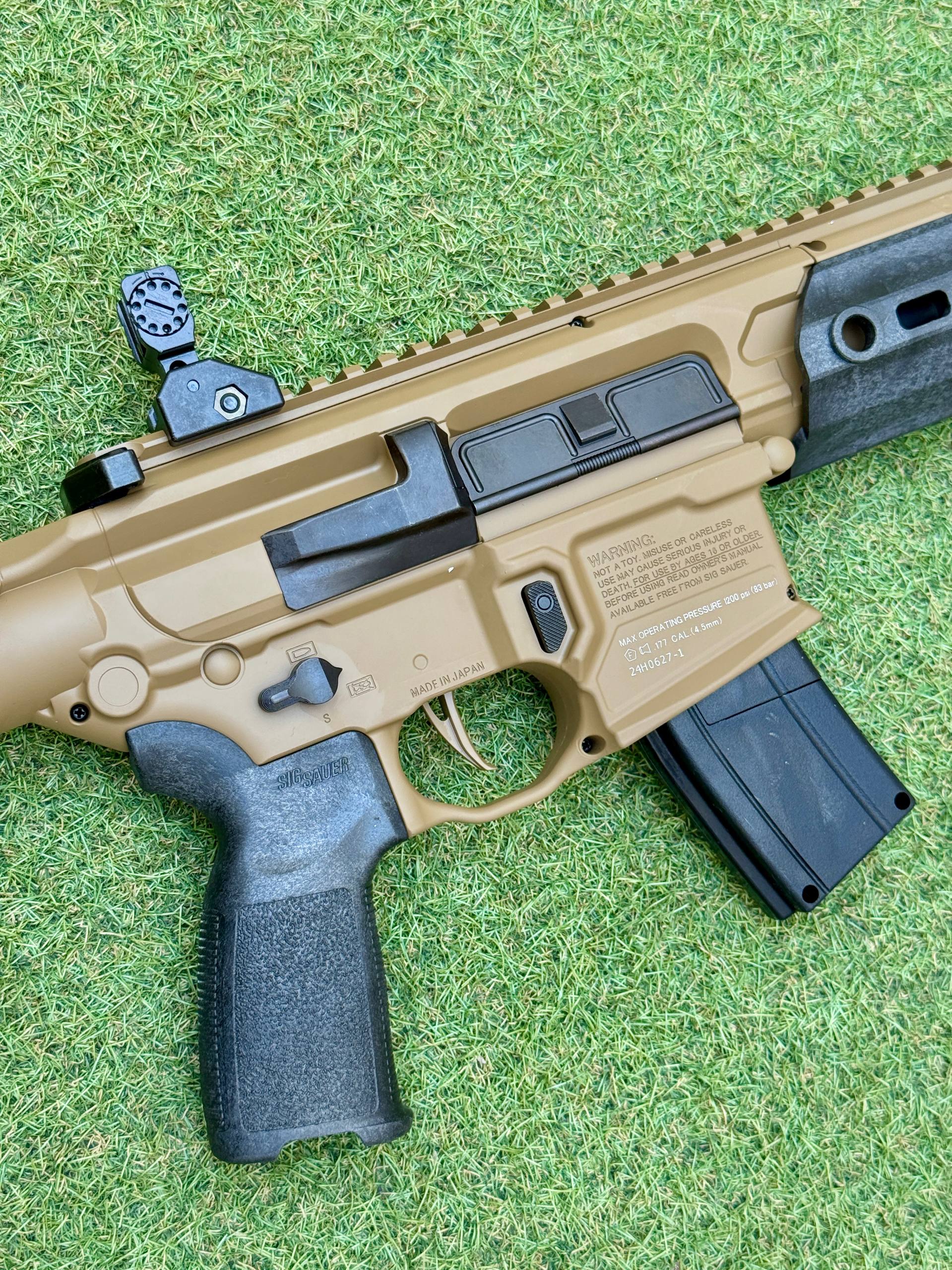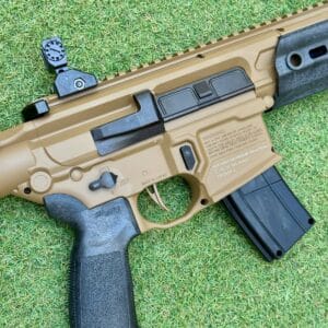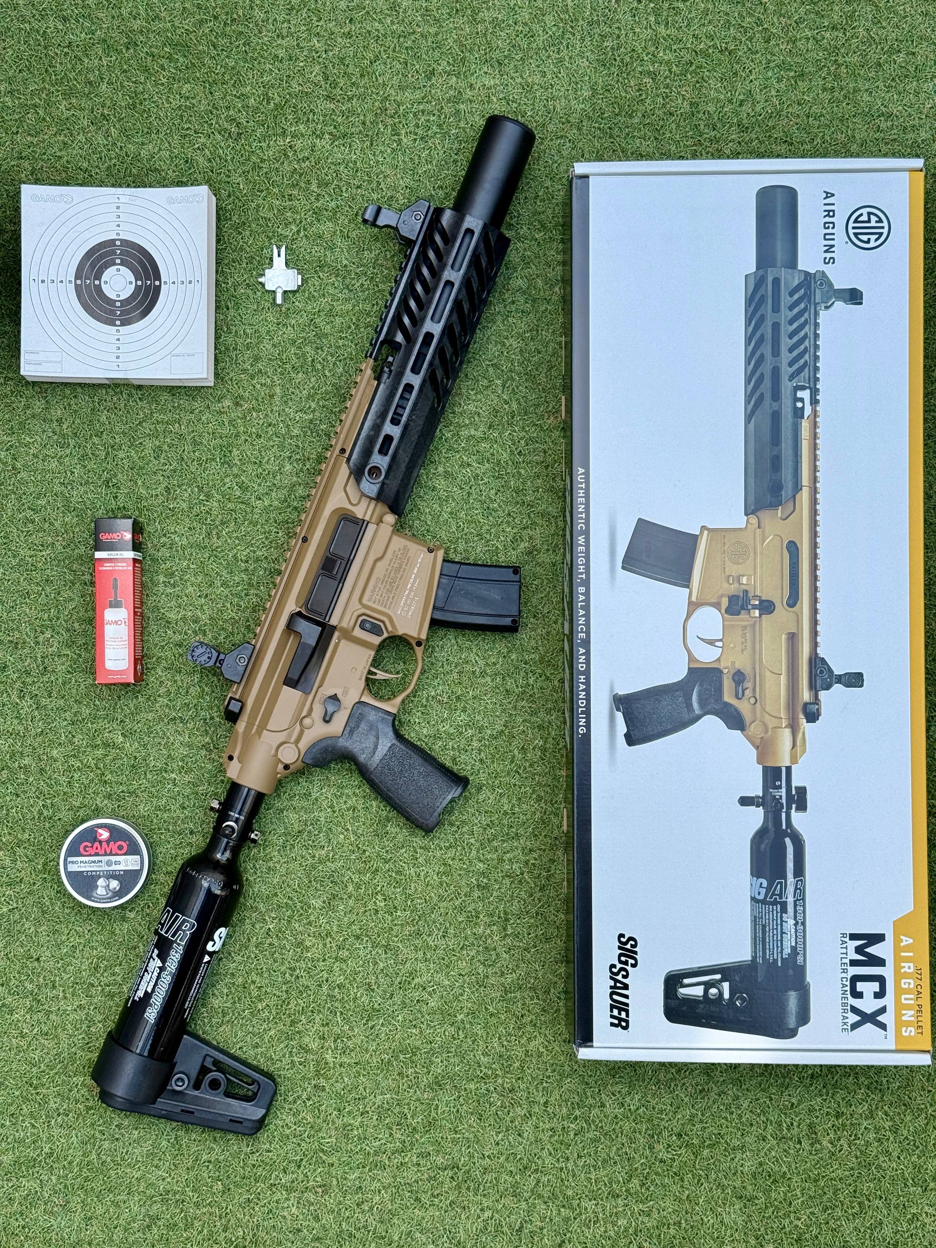 Sig Sauer MCX Rattler Canebrake PCP. Subfusil de PCP táctico semi-automático del calibre 4,5 mm, con diseño compacto y fácil de manejar, en un atractivo color arena. Incluye un cajón de mecanismos metálico, un guardamanos sintético con sistema de montaje de accesorios de bloqueo modular M-LOK™ integrado, una mira abatible sobre un riel Picatinny completo y un cañón revestido. El MCX Canebrake calibre .177 le permite mantener el blanco durante más tiempo con menos recargas gracias a su cargador SIG Rapid Pellet de 30 cartuchos. Su botella de aluminio le da una gran autonomía.