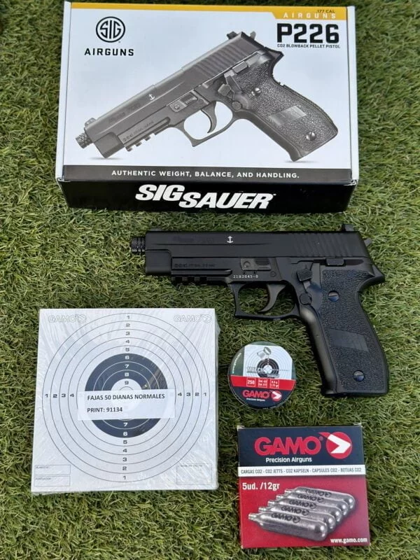 Sig Sauer P226 Pistola Co2 Pack. Pistola semiautomática de Co2 con corredera Blowback, cargador rotativo doble con capacidad para 16 proyectiles del calibre 4,5 mm., miras abiertas y rail inferior para accesorios. Replica realista del modelo P226 la afamada pistola alemana.