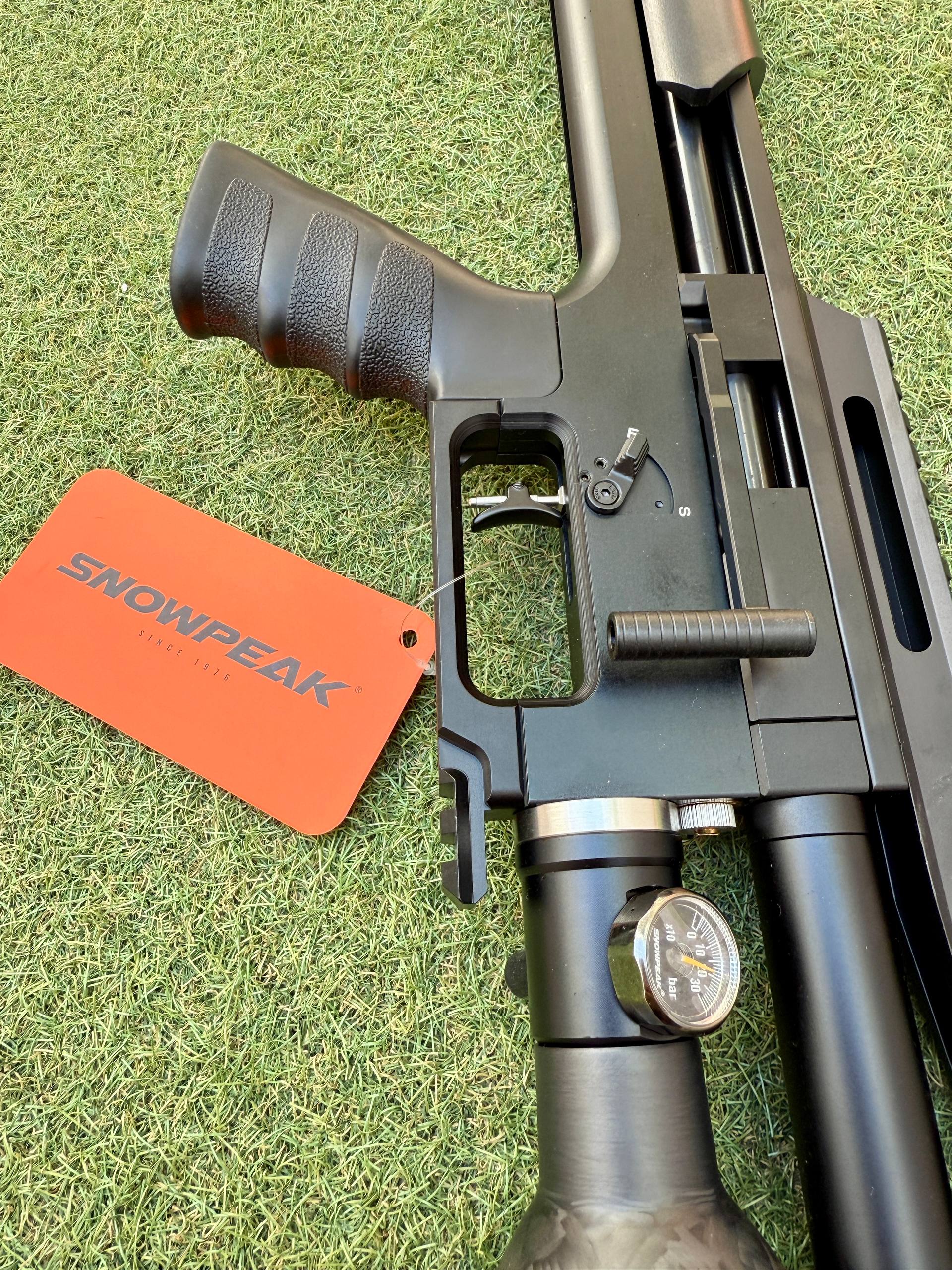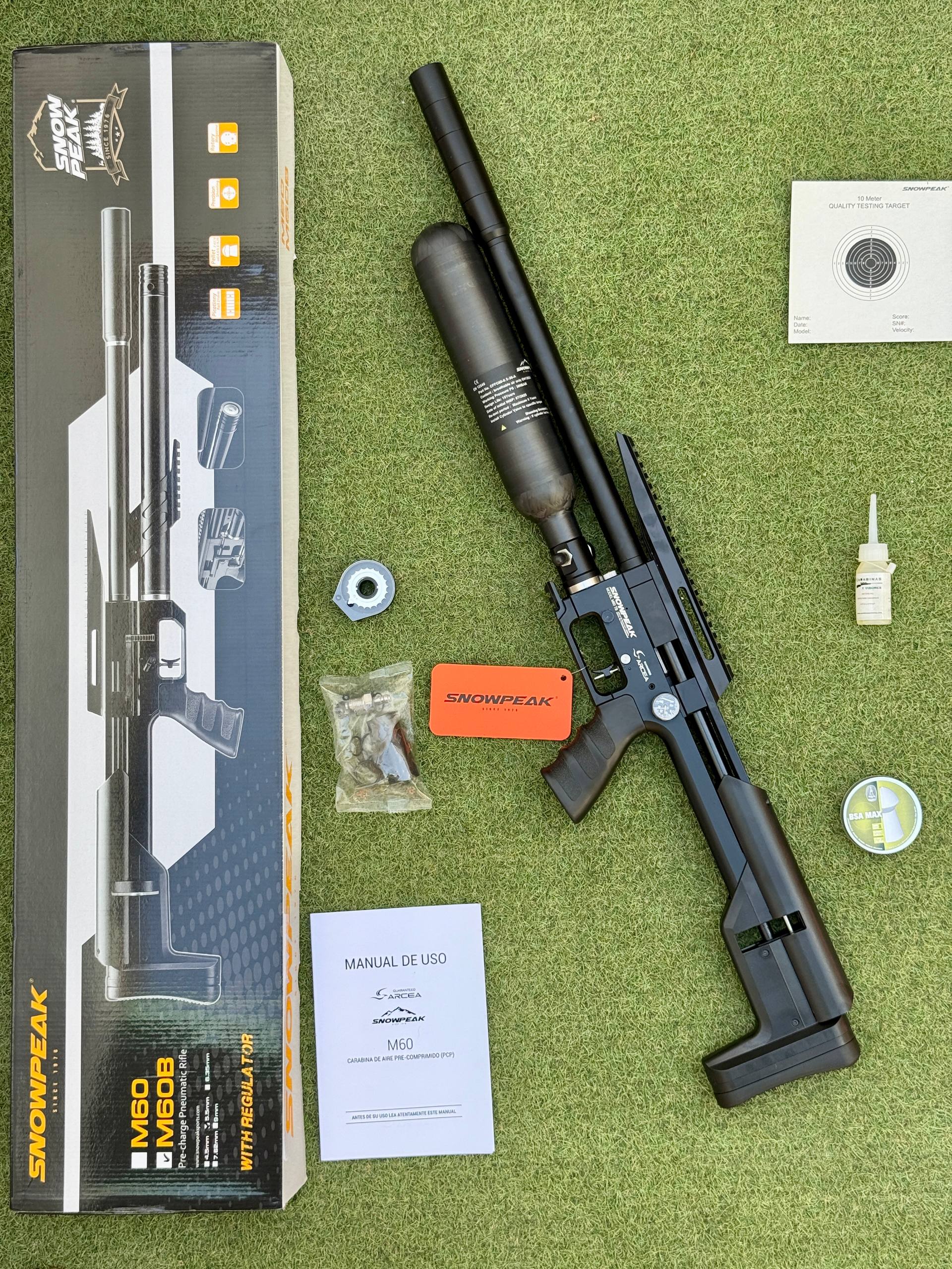 Snowpeak M60BT Carabina Pcp Botella Carbono. Rifle Pcp regulado, modelo Táctico con ≤24 Julios de Potencia y depósito tipo botella de 500 cc de capacidad a 250 bares de presión máxima. Equipado con supresor de sonido y cargador para 20 balines.
